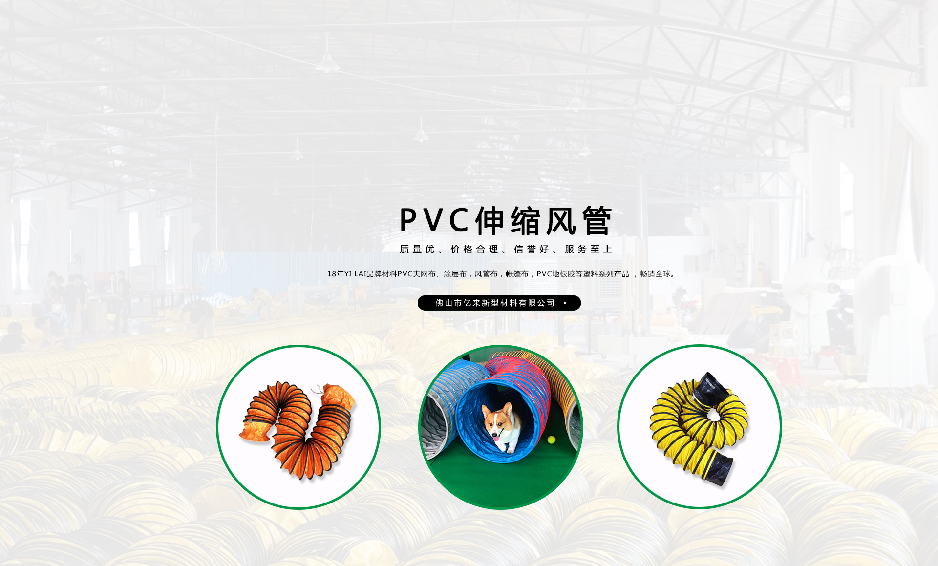 創(chuàng)建“YILAI品牌”近20年來,產(chǎn)品質量穩(wěn)定提高,生產(chǎn)及經(jīng)營的產(chǎn)品包括PVC夾網(wǎng)布、PVC彩條布、PVC風管布、PVC涂層布、PVC籬笆圍護欄布、PVC透明夾網(wǎng)布、PVC伸縮風管、車縫風管、寵物管、耐高溫風管、地下室通風管,保溫通風管、空調排風管、正負壓通風管、三通/四通排風管、防靜電風管、隧道風管、PVC地板膠等系列產(chǎn)品在市場上得到廣大客戶認可,暢銷歐美、東南亞、非洲、中東等國外市場。
